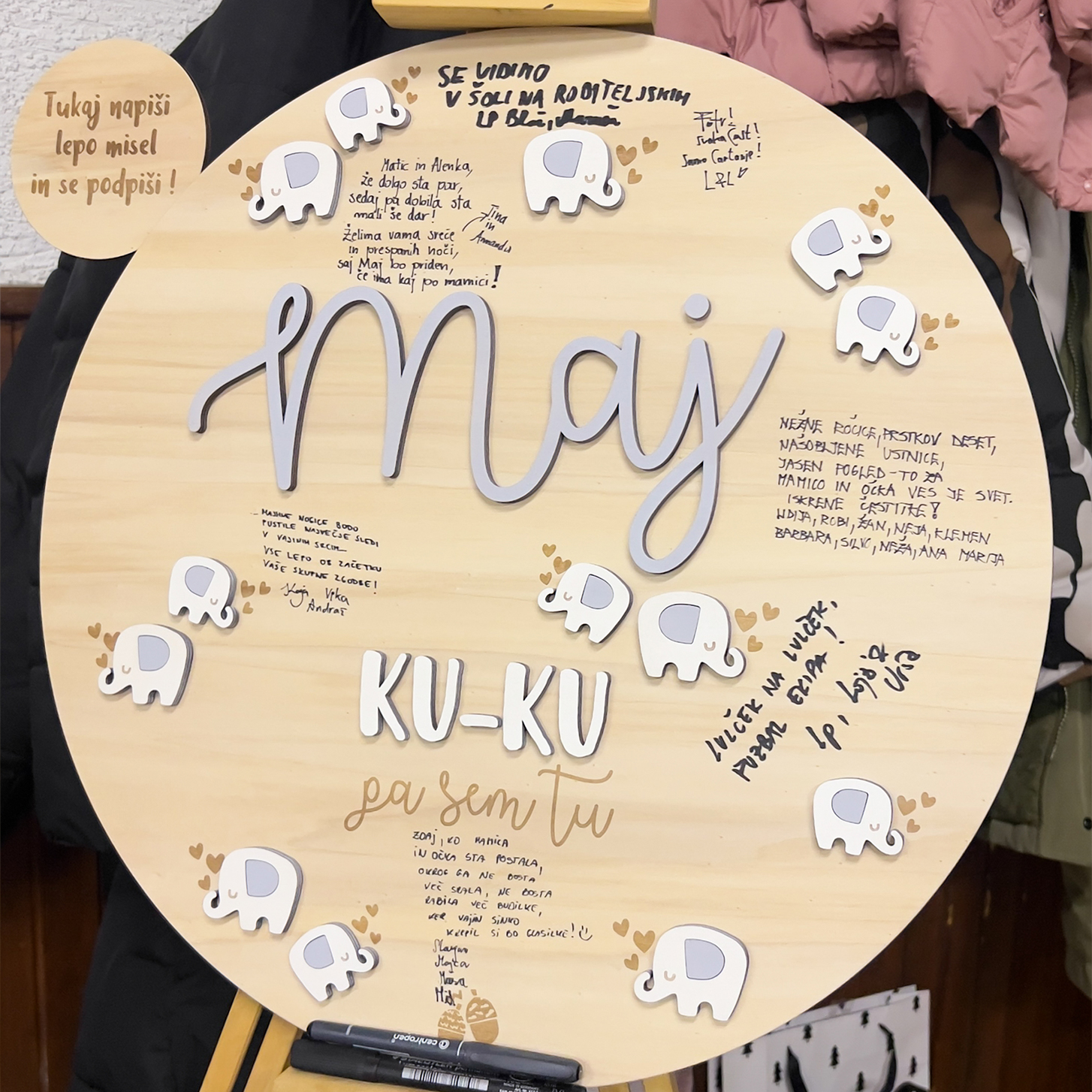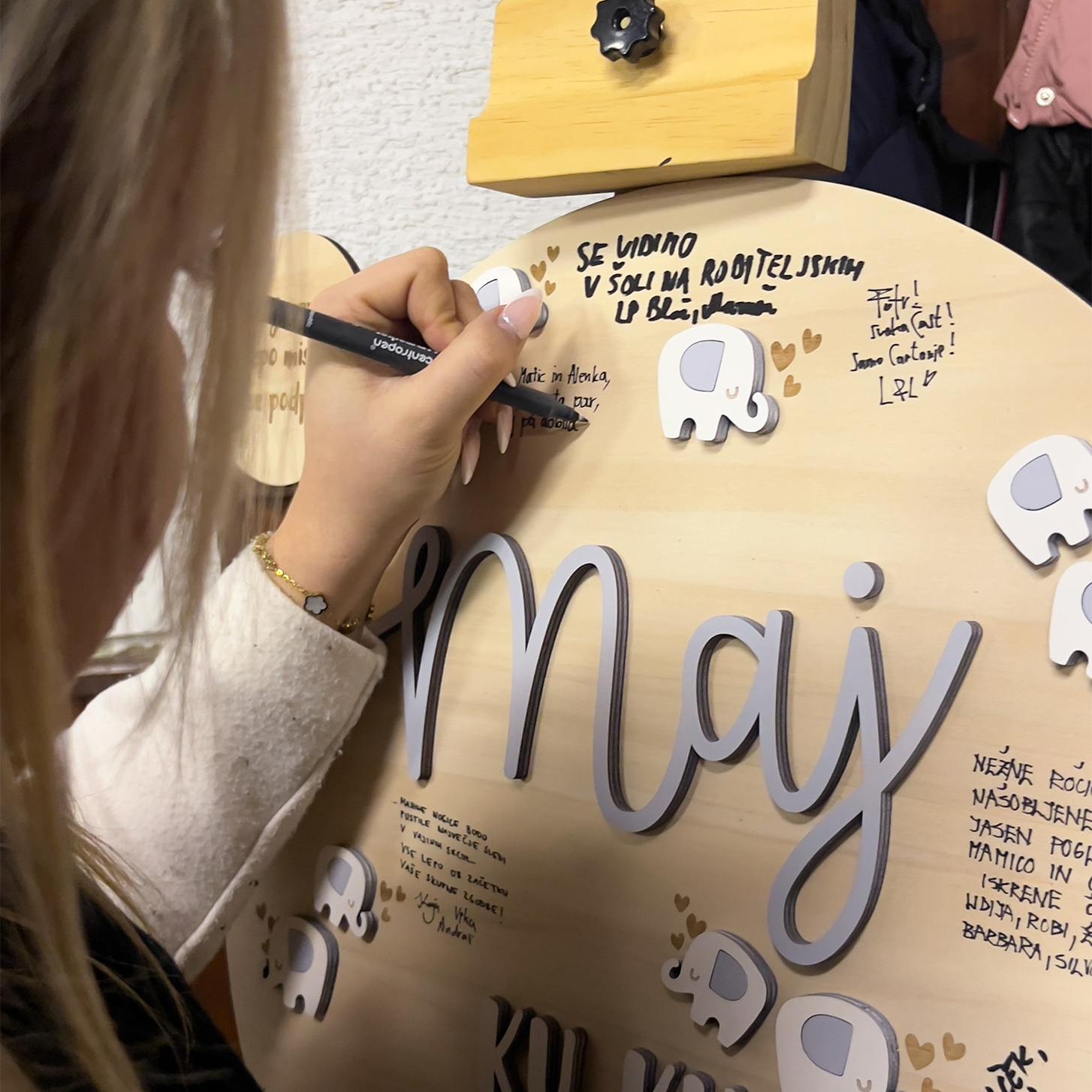 Naša personalizirana lesena tablica z imenom in čudovitim motivom slončkov je neprecenljiv spomin na enega najlepših trenutkov v življenju. Tablica je oblikovana tako, da nanjo lahko družina in prijatelji napišejo svoje želje, podpise ali sporočila, kar jo spremeni v unikaten trajen spomin.